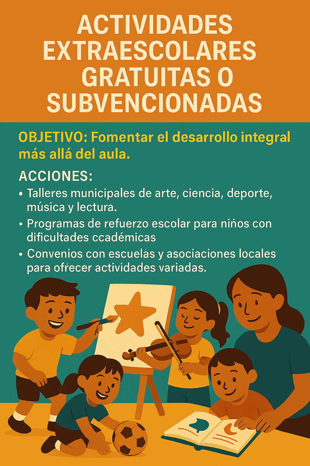 Talleres municipales de arte, ciencia, deporte, música y lectura.